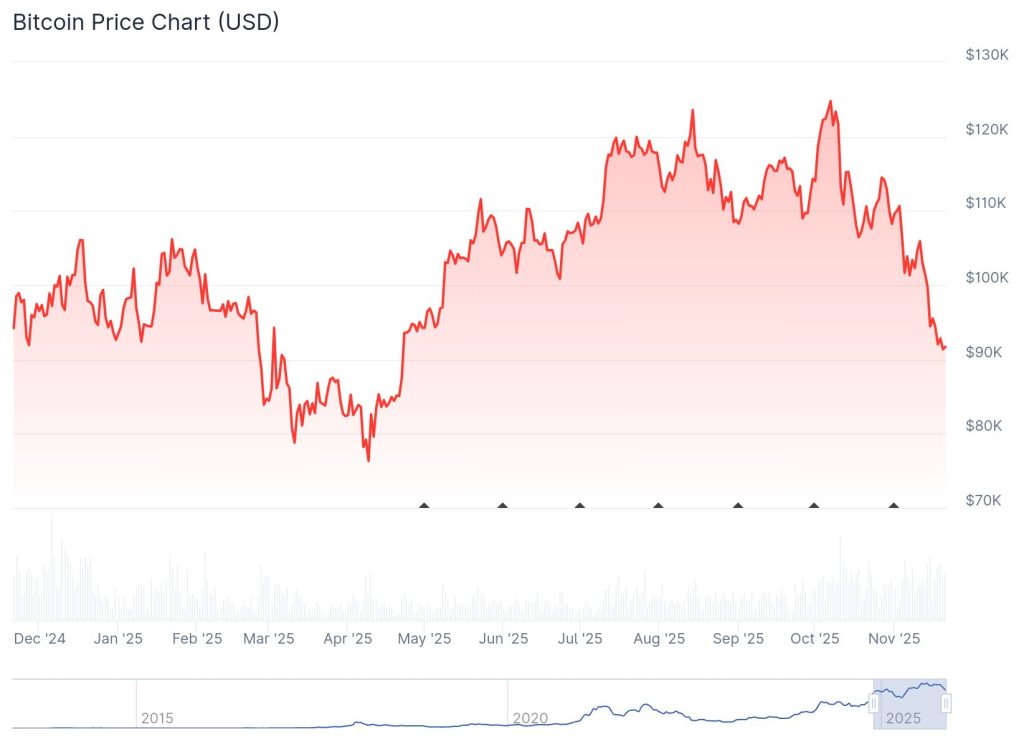 Üblicherweise steigt Bitcoins Marktanteil in starken Abwärtsphasen, da Altcoins schneller und stärker fallen. Das sorgt normalerweise für eine wachsende Bitcoin-Dominanz, selbst wenn BTC-Verluste einstecken muss. Doch diesmal bricht dieses historische Muster. Trotz eines Rückgangs von 126.000 US-Dollar auf rund 90.000 US-Dollar ist die Dominanz überraschend zurückgegangen.