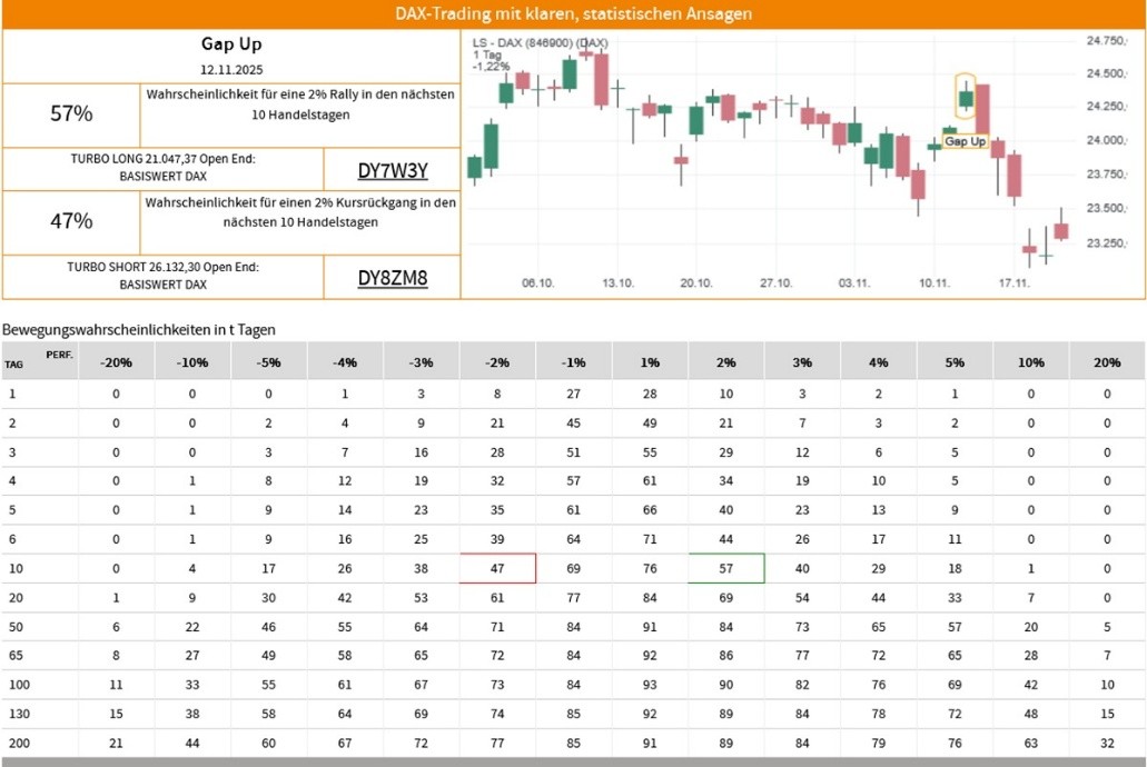 Die Erfolgswahrscheinlichkeiten für das Signal "Gap Up" beruhen auf einer historischen Auswertung des Signals auf den LS-DAX im Zeitraum vom 02.01.2000 bis zum 20.11.2025. Dabei wurden die folgenden Voreinstellungen und Filter vorgenommen:
