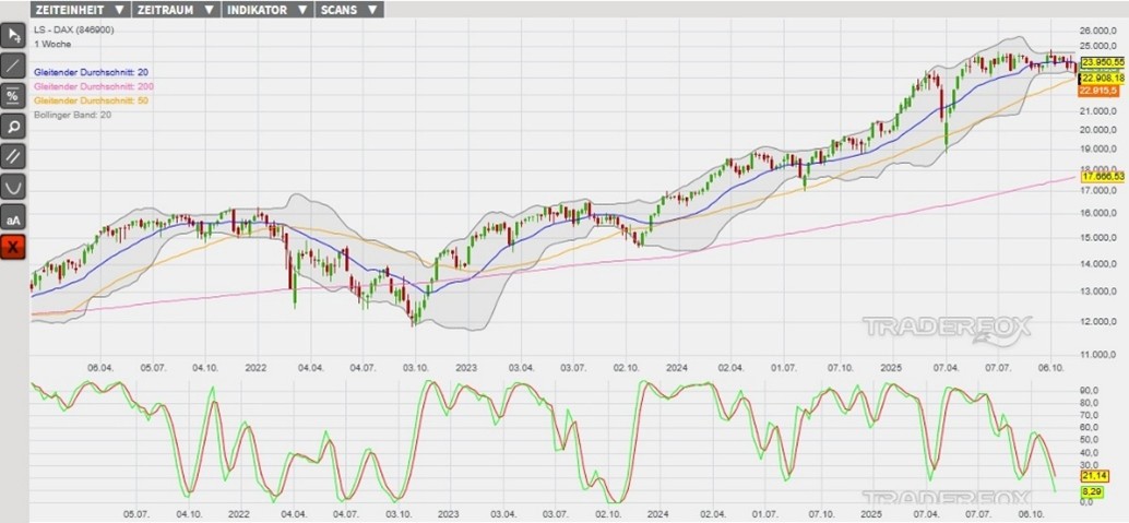 Charttechnisch könnte der DAX mit dem Unterschreiten des Tagestiefs vom 20. November bei 23.276 Punkten (Unterstützung 1) heute eine neue Verkaufswelle einleiten. In diesem Szenario könnte die Kursentwicklung in den kommenden Tagen in Richtung des unteren Bollinger-Bandes und zum lokalen Minimum vom 18. November bei 23.080 Punkten (Unterstützung 2) tendieren. Als eine Anlagemöglichkeit in den DAX stehen verschiedene derivative Produkte zur Verfügung. Ein Beispiel ist der ENDLOS TURBO SHORT 26.132,30 OPEN END: BASISWERT DAX der DZ BANK (WKN: DY8ZM8)* mit einem Basispreis von 26.132,30 Punkten. Der Hebel liegt am 21.11.2025 um 07:00 Uhr bei 7,14. Das Short-Szenario ist hinfällig, wenn der DAX über die Marke von 23.900 Punkten (Widerstand 2) steigt. Bitte beachten Sie die Produktrisiken, welche unten im Dokument beschrieben sind.