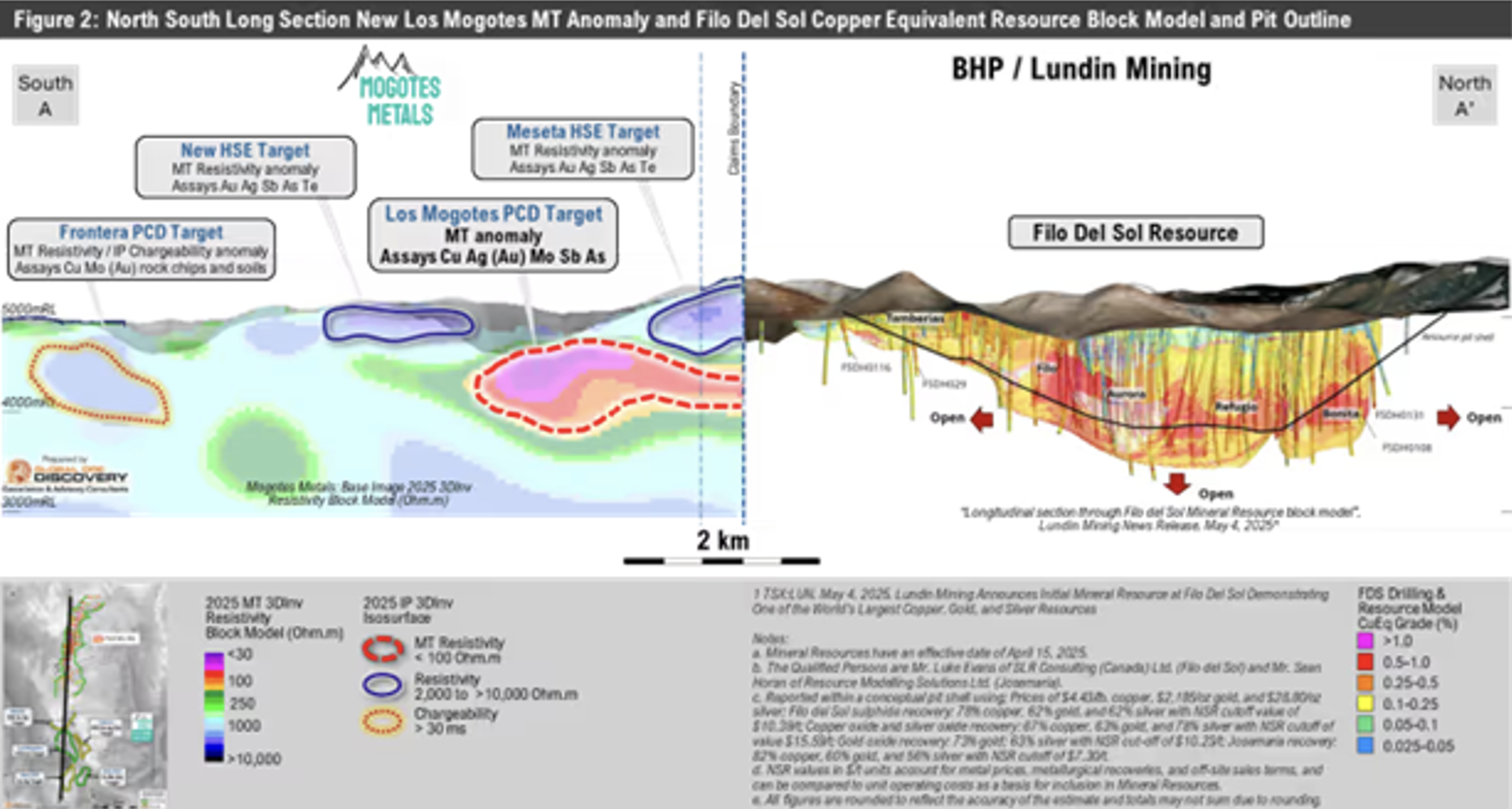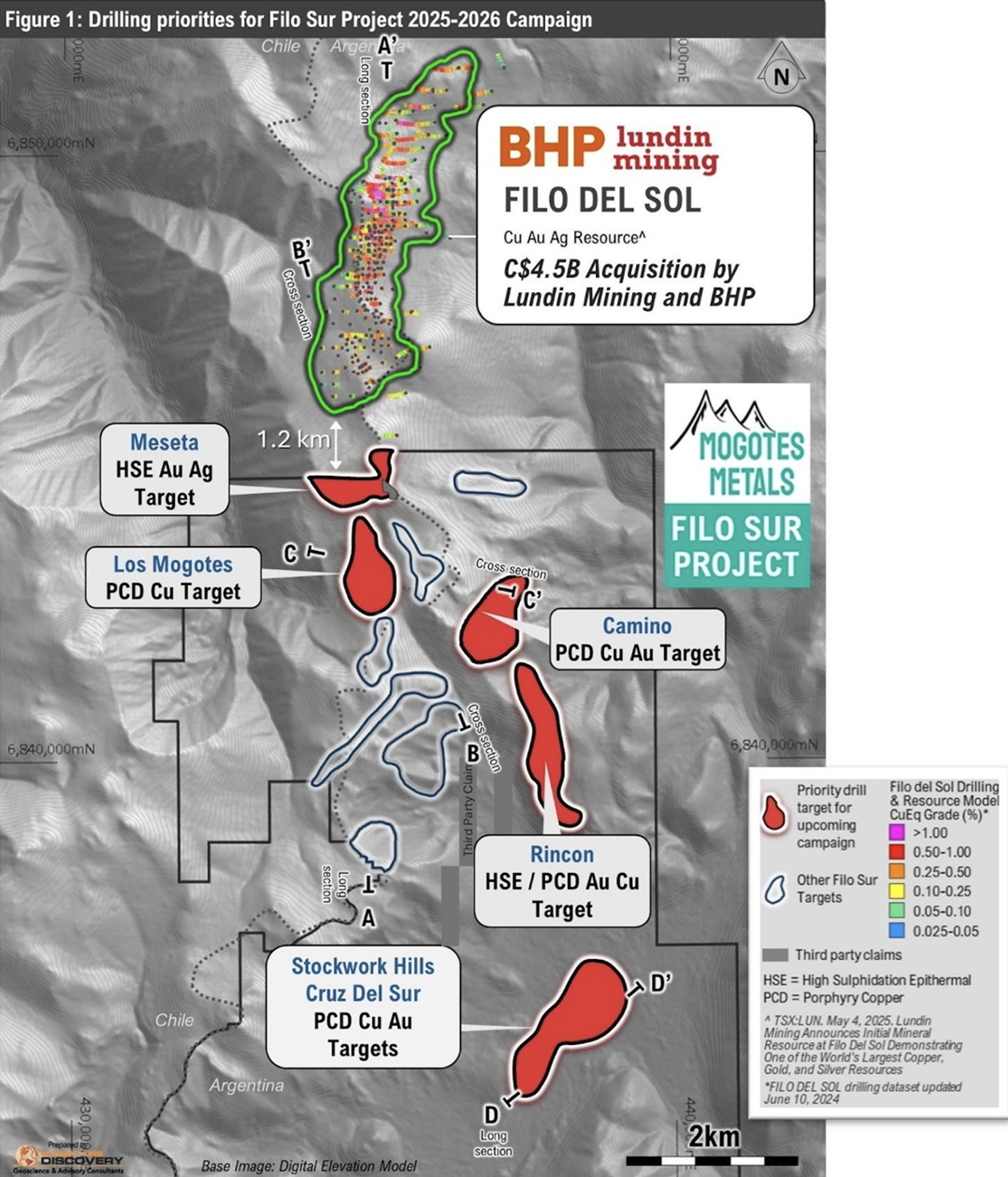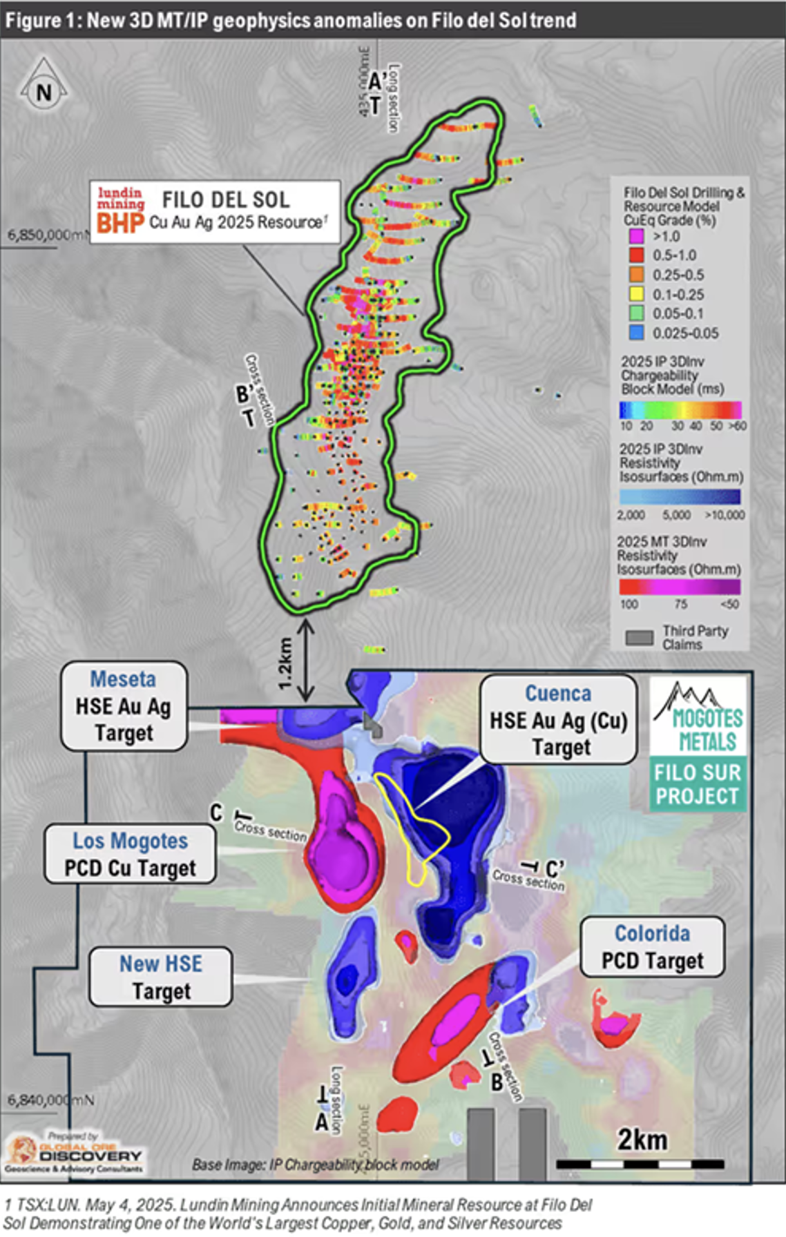 Mogotes Metals (WKN: A3ENQ6) Ausnahme-Asset "Filo Sur', das im "Vicuña Distrikt' und damit in DEM globalen "Kupfer-Gold-Silber'-Hotspot im argentinischen-chilenischen Grenzgebiet liegt, mit schätzungweise13 Millionen Tonnen Kupfer, 32 Millionen Unzen Gold und 659 Millionen Unzen Silber, lässt wieder einmal sein einmaliges Potenzial aufblitzen! Und zwar diesmal in Form der Ergebnisse eines 3D-geophysikalischen Modells. Dieses umreißt nun gleich mehrere überzeugende großflächigen Anomalien, und das auch noch direkt südlich der Mega-Ressource "Filo Del Sol'. Das von BHP/Lundin betriebene Projekt gilt als die größte "Greenfield'-Entdeckung der letzten 30 Jahre, mit geschätzten Reserven von phänomenalen 2,2 Milliarden Pfund Kupfer, 286 Millionen Unzen Silber und 133,33 Millionen Unzen Gold2.