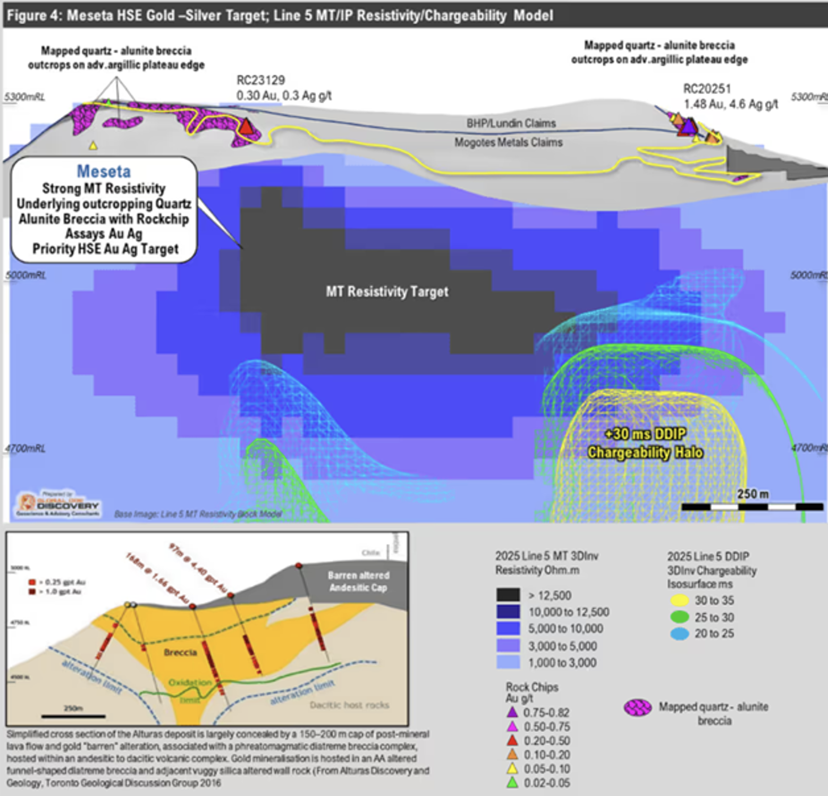 Aber auch andere Gebiete wie "Meseta' weisen geologische Besonderheiten wie das Vorkommen edelmetallhaltiger, durch Quarz-Alunit alterierte Brekzien auf, die auf hochgradiges Ressourcen-Potenzial im Stile von "Filo Del Sol' hindeuten.