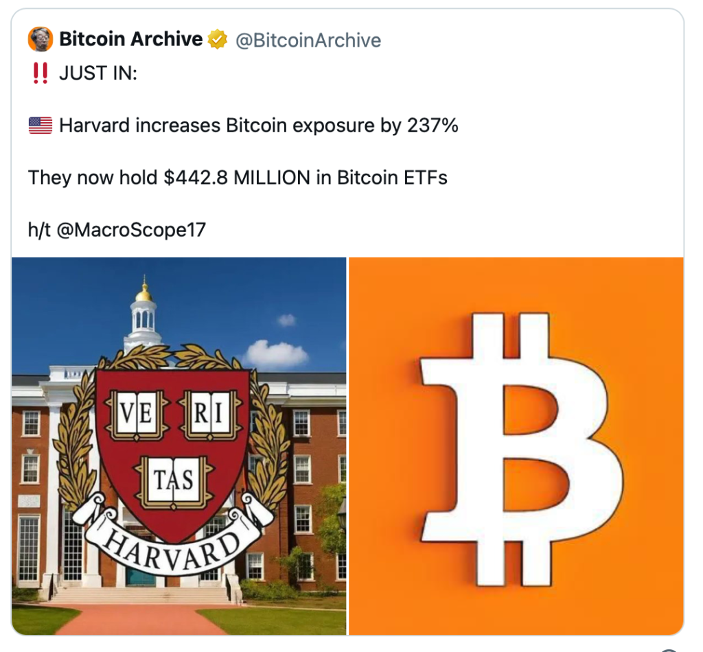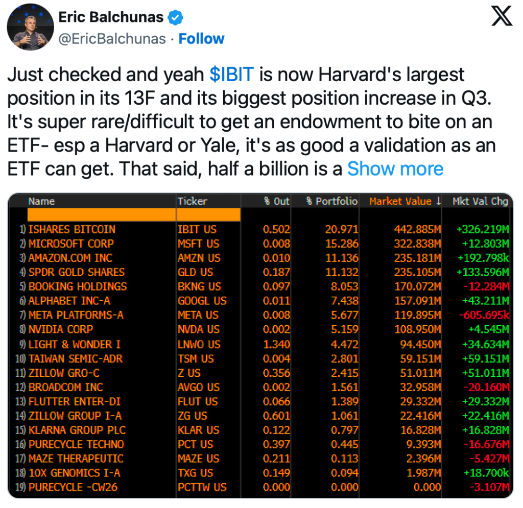 Ebenfalls bemerkenswert: Auch Harvard steigert seine Bitcoin-Investitionen drastisch. Der milliardenschwere Stiftungsfonds der Eliteuniversität hat seine BTC-ETF-Positionen um rund 257 Prozent erhöht und hält nun rund 443 Millionen US-Dollar in Bitcoin-Produkten. ETF-Experte Eric Balchunas bestätigte zudem, dass IBIT inzwischen die größte Position im Harvard-Portfolio ist - eine Seltenheit für akademische Stiftungsfonds.