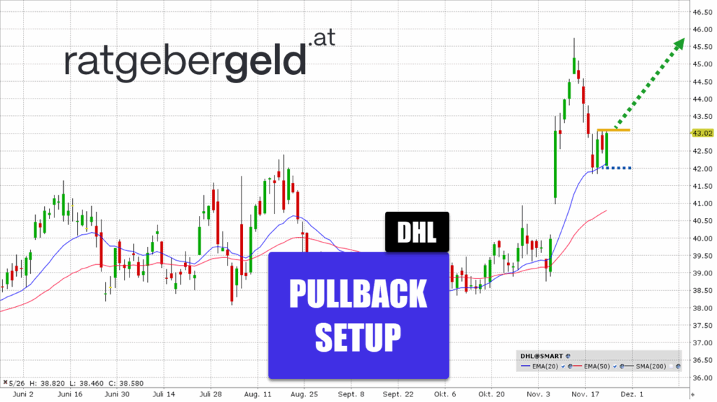 Nach der Veröffentlichung der Quartalszahlen am 06. November ging es mit der DHL-Aktie steil bergauf. Im Bereich von 45.50 Euro drehte das Papier nach Süden und fand Halt an der 20-Tagelinie.