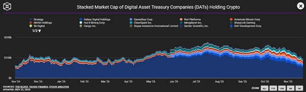 Während die DATs zuvor noch als einer der größten Kurstreiber gewirkt hatten, ist der zunehmende Druck auf diese auch mit größeren Gefahren für die Kryptoinvestments verbunden. Denn laut den Angaben von The Block hat sich die Marktkapitalisierung der DATs seit Mitte Juli von 176,02 Mrd. USD auf mittlerweile nur noch 94,78 Mrd. USD um rund 46 % verringert, wobei hier nur ein Teil von ihnen erfasst wird.