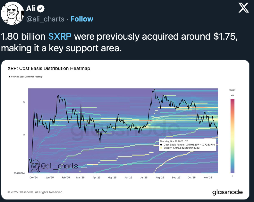 Die Cost-Basis-Heatmap zeigt, dass bei 1,75 $ rund 1,8 Milliarden XRP gekauft wurden. Diese Zone bildet daher den nächsten großen Support. Ein Rücksetzer dorthin würde zwar weitere Verluste bedeuten, könnte jedoch die Basis für eine Erholungsbewegung liefern.