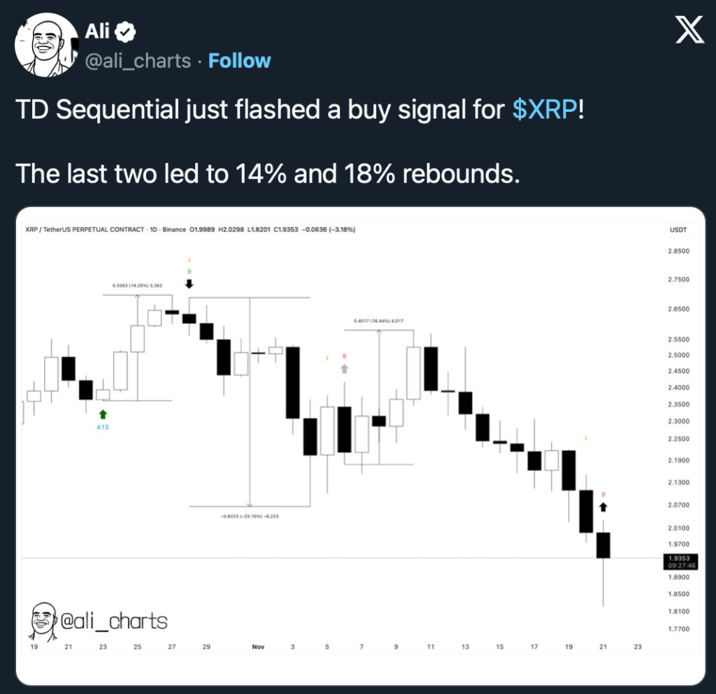 Der bekannte Analyst Ali Martinez verweist zudem auf ein frisches TD Sequential Buy-Signal auf dem Tageschart - die letzten beiden Signale führten zu Rebounds von 14 % bzw. 18 %. Damit könnte XRP kurzfristig wieder über die Marke von 2 $ springen.