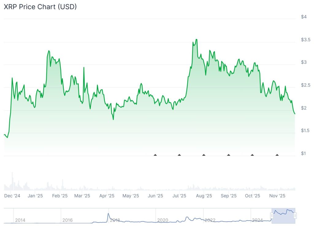 Vom Jahreshoch bei 3,65 $ im Juli ist XRP inzwischen weit entfernt. Seit dem Flash-Crash am 10. Oktober verlor der Coin zunächst den 3-Dollar-Bereich und fiel kurz darauf unter den 2-Dollar-Support. Mit rund 1,90 $ liegt der Kurs im Monatsvergleich etwa 21 % im Minus, die Marktkapitalisierung ist auf 114 Mrd. $ gefallen.