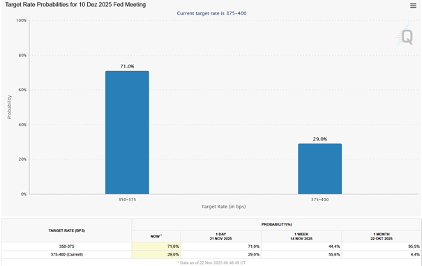 Der RSI hat mittlerweile auch einen Wert von 24,68 erreicht, wobei Bitcoin bereits bei 30 überverkauft ist. Ähnlich extrem hat sich der Crypto Fear & Greed Index entwickelt, der in der vergangenen Woche bis auf 10 gefallen war und mittlerweile wieder bei 13 steht sowie einen Boden zu bilden scheint. Zwar können bei Indikatoren noch tiefere Werte erreichen, jedoch hat die Chance für mindestens einen temporären Bounce erheblich zugenommen. Zumal auch die Wahrscheinlichkeit für die 25 Basispunkte durch die Fed im Dezember derweilen wieder bei 71,0 % liegt.