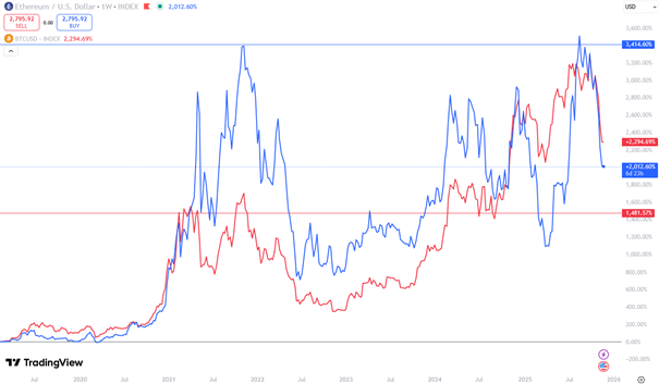 Vergleicht man die Kursentwicklungen von Ethereum und Bitcoin in diesem Zyklus, so hat BTC sein vorheriges Allzeithoch von rund 69.000 USD bereits um 83 % übertroffen, während ETH im Unterschied zu dem vorherigen Rekordhoch von fast 4.900 USD nur ein rund 2 % höheres Hoch ausbilden konnte.