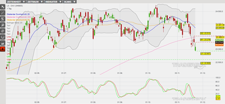 Der DAX hat am 09. Oktober ein Allzeithoch bei 24.775 Punkten markiert. Seither hat der Index eine untergeordnete Abwärtstrendstruktur mit sinkenden Verlaufshochs und -tiefs im Chart etabliert. Ausgehend vom Verlaufshoch am 12. November bei 24.445 Punkten ist der Index dabei bis zum lokalen Minimum am 18. November bei 23.080 Punkten um 1.365 Punkte eingebrochen. Zum Abbau der überverkauften Marktlage folgte dann eine Zwischenerholung in Richtung des gleitenden Durchschnitts der letzten 200 Handelstage. Der nachhaltige Ausbruch über diesen GD 200 ist allerdings misslungen. Stattdessen wurde eine weitere Verkaufswelle eingeleitet, welche die Kursentwicklung am 21. November temporär auf ein Mehrmonatstief geführt hat. Die sich ausweitenden Bollinger-Bänder und Verkaufssignale der gleitenden Durchschnitte der letzten 20, 50 und 200 Börsentage wirken dabei als Belastungsfaktoren. Außerdem haben beide Signallinien der Slow Stochastik überverkaufte Werte von unter 20 Punkten angenommen. Sollte die grüne Signallinie des Oszillators wieder nachhaltig über die rote Signallinie steigen, dann könnte ein neues Kaufsignal getriggert werden.