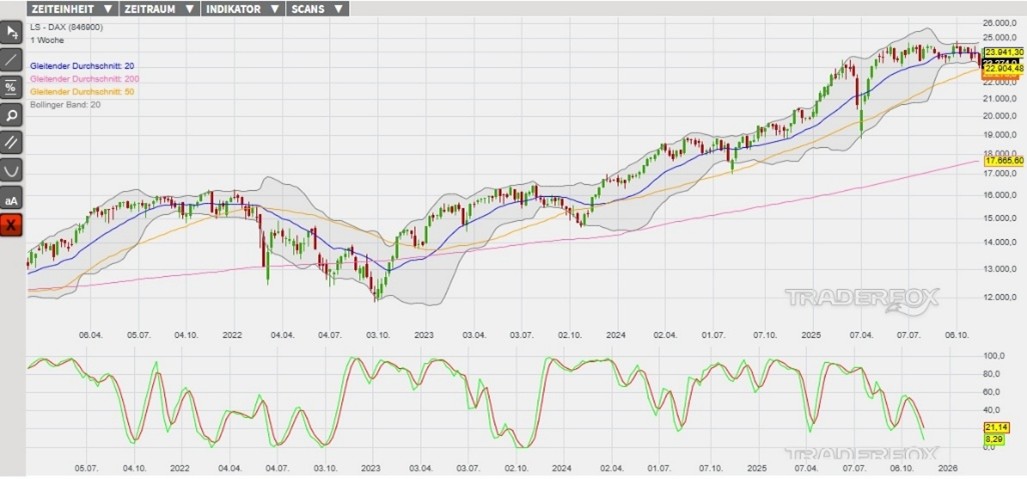 Der Chart zeigt die Entwicklung des Indikators der Slow Stochastik in der Vergangenheit. Zukünftige Ergebnisse können sowohl niedriger als auch höher ausfallen. Eine Kerze im Chart entspricht einer Börsenwoche. Quelle: https://www.dzbank-wertpapiere.de/markets/daxanalyse