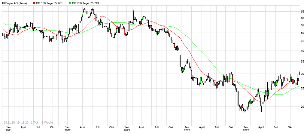 Analysten zeigen sich gespalten: Jefferies belässt Bayer auf "Hold" mit einem Kursziel von 25 Euro, während Berenberg 30,40 Euro und Goldman Sachs sogar 34,50 Euro anpeilen. Der Konsens liegt bei rund 28,5 Euro, die Mehrheit empfiehlt Halten.