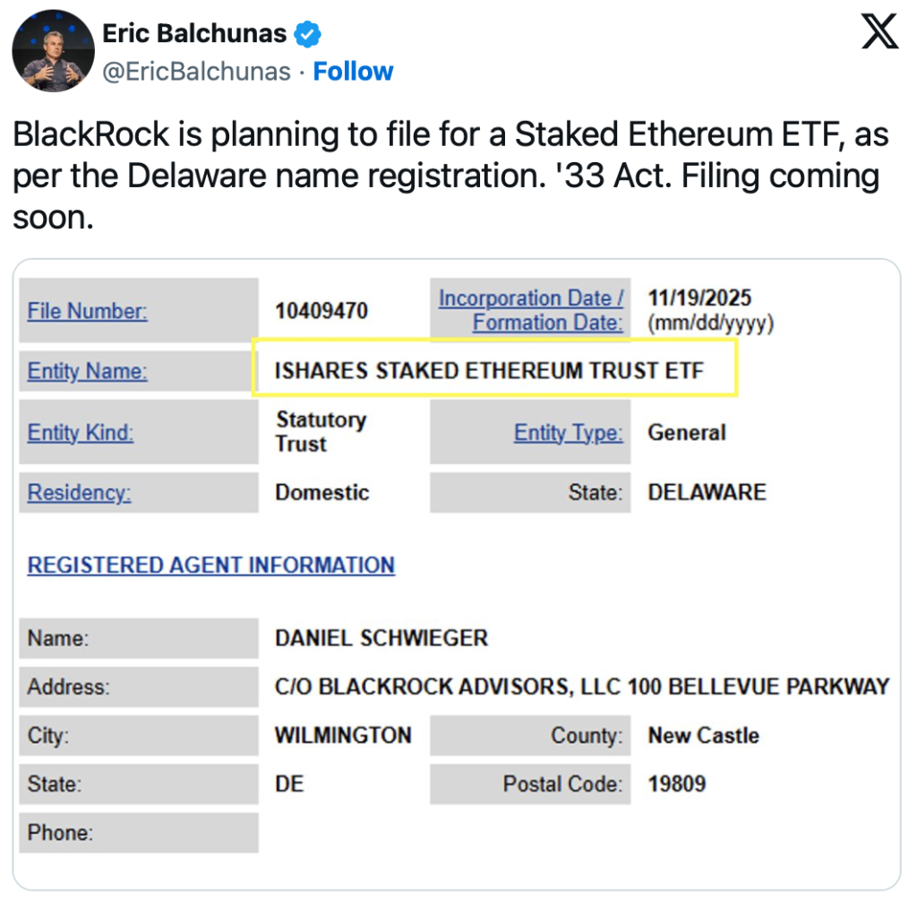 Nachdem Ethereum durch die Zulassung von Spot-ETFs in den USA bereits stark profitiert hat, legt BlackRock nun offenbar nach. Ein neues Filing im US-Bundesstaat Delaware deutet darauf hin, dass der Finanzriese an einem Ethereum-ETF mit Staking-Funktion arbeitet.