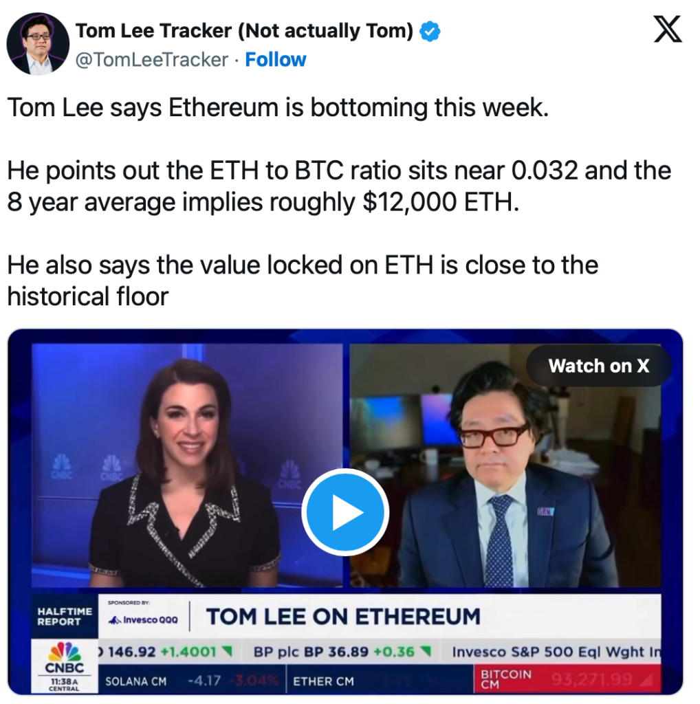Darüber hinaus liegt der Total Value Locked (TVL) - das in DeFi-Protokollen gebundene Kapital - im Verhältnis zur Marktkapitalisierung von Ethereum derzeit nahe bei 1,0. In der Vergangenheit war das häufig ein starkes Einstiegssignal. Lee betont, dass sowohl Fundamentaldaten als auch Marktstruktur derzeit für Ethereum sprechen.