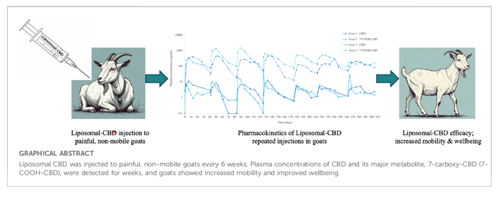Zwei Ziegen mit chronischen und stark beeinträchtigenden Schmerzen wurden zehn Monate lang alle sechs Wochen mit subkutanen Injektionen von synthetischem liposomalem Cannabidiol (LPT-CBD, 5 mg/kg) behandelt. Während der gesamten Studie wurden regelmäßig Blutproben entnommen, um die Plasmakonzentrationen von CBD und seinen Metaboliten sowie hämatologische und biochemische Parameter vor und bis zu sechs Wochen nach jeder Verabreichung zu bestimmen. Die Wirksamkeit wurde von den Betreuern anhand einer wöchentlichen Lebensqualitätsbeurteilung (QoL) bewertet, und Nebenwirkungen wurden überwacht. Zu den wichtigsten Ergebnissen zählen: