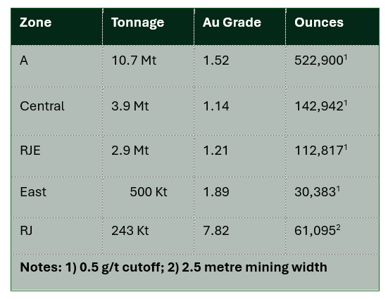 Das ist angesichts der hohen Dichte an Probebohrungen in den Zone A und RJ sehr konservativ angesetzt. Durch die sehr hohe Anzahl an Bohrungen mit Goldtreffern ist die Wahrscheinlichkeit, dass diese historischen Ressourcen im vollen Umfang oder zu mindestens 75% bestätigt werden, für den Bergbausektor überdurchschnittlich hoch.