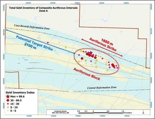 Denn die Zone A wurden von den Vorbesitzern zusammen mit der Zone RJ besonders umfangreich exploriert. Insgesamt wurden hier 55 Bohrungen über insgesamt 14.693 Meter durchgeführt. 84% dieser Bohrlöcher zeigten Goldmineralisierungen. Dieser sehr hohe Prozentsatz ist ein Beleg, dass Zone A ein umfangreiches Goldvorkommen beinhalten dürfte.