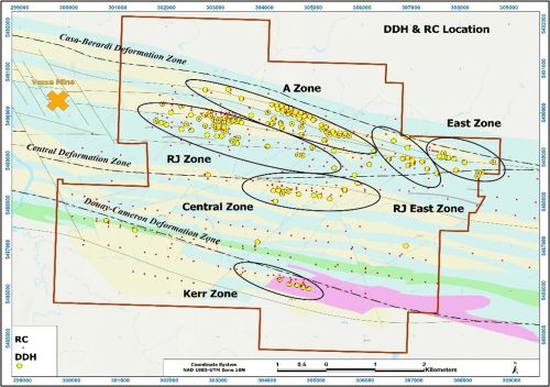 Das N2-Projekt wurde von den Vorbesitzern, darunter Agnico Eagle Gold, in der Vergangenheit in einigen Teilen sehr umfangreich exploriert. Insgesamt wurden 236 Bohrlöcher über 55.517 Meter durchgeführt. Das ist sehr viel. Das Besondere an den vergangenen Probebohrungen: Der Fokus lag auf zwei Gebieten namens Zone A und Zone RJ, wo viel Gold gefunden wurde.