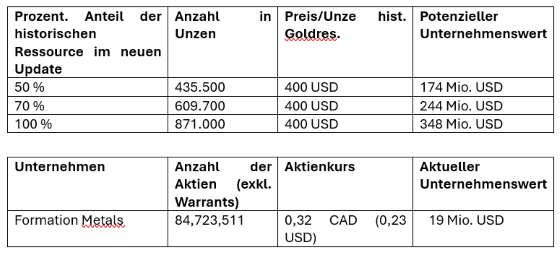 Bei der Bestätigung der historischen Ressourcen für das N2-Goldprojekt gehen wir konservativ vor und kalkulieren nur mit 50% der 871.000 Unzen der historischen Ressourcenschätzung. Sprich: Formation Metals kann mit seinem kommenden Bohrprogramm nur 50% der historischen Ressourcen bestätigen.