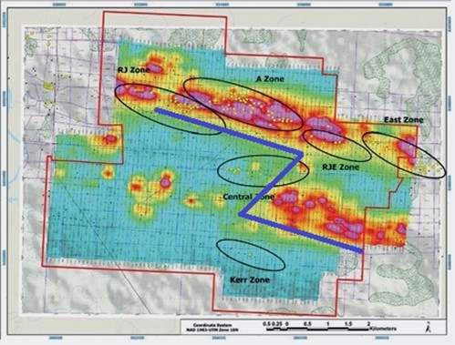 Der wahre Verlauf des Bulk-Vorkommens könnte also nicht wie eine Linie von Westen nach Osten, sondern vielmehr wie der Buchstaben Z aussehen (blaue Linien in der Grafik): Vom Westen über die Zone A - und dann geht das Kernvorkommen versetzt in der Zone Central weiter. Das wäre ein spektakulärer Fund. Sie sehen dies in dieser geologischen Analyse: