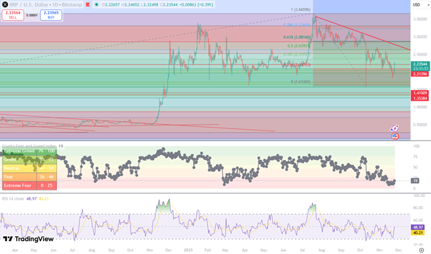 Aktuell kann XRP vor allem von der deutlich höheren Chance für eine Zinssenkung durch die Fed im Dezember profitieren, die sich aufgrund der schwachen Arbeitsmarktdaten und der geringeren Inflation nach dem Abfall auf 40 % schnell wieder auf 82,9 % erholen konnte. Da Kryptowährungen stark vom günstigen Geld abhängig sind, dürfte die Rally nun erstmal weitergehen. Angesichts der relativ hohen Bewertung sind bis 2026 hingegen eher nur 4,93 bis 5,30 USD zu erwarten.