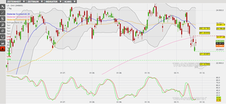 Der DAX befindet sich in einem langfristigen Aufwärtstrend, welcher am 09. Oktober durch den Kursanstieg auf ein Allzeithoch bestätigt wurde. Nach der jüngsten Korrekturbewegung konnte der Index wiederum am 21. November nach einem Gap-Down Stabilisierungstendenzen am unteren Bollinger-Band zeigen. Der Schlusskurs lag dabei über dem Eröffnungskurs, wodurch eine grüne Tageskerze geformt wurde. Hierdurch konnte die Basis für eine Erholungsbewegung gelegt werden, welche zugleich durch ein Kaufsignal in der überverkauften Slow Stochastik bestätigt wird. Der Oszillator hat das Kaufsignal getriggert, als die grüne Signallinie über die rote Signallinie gestiegen ist. Ein weiteres Kaufsignal könnte erzeugt werden, sobald der Index wieder nachhaltig über den gleitenden Durchschnitt der letzten 200 Börsentage (=GD 200) steigt. Die erste Barriere in diesem Szenario markiert wiederum das Verlaufshoch vom 20. November bei 23.510 Punkten (Widerstand 1). Der Kursanstieg über dieses Hindernis könnte weitere Kursanstiege in Richtung des GD 20 bei derzeit 23.791 Punkten (Widerstand 2) auslösen. Sollte auch der gleitende Durchschnitt der letzten 20 Börsentage überwunden werden, dann könnte das entstehende Kaufsignal weitere Kursanstiege in den Folgetagen erleichtern. Impulse erwarten die Anleger heute unter anderem durch das deutsche Bruttoinlandsprodukt für das 3. Quartal und Wirtschaftsindikatoren aus den USA. Vorbörslich wird der DAX mit einem Kursrückgang von -0,1 % getaxt. Das Long-Szenario ist hinfällig, wenn der DAX unter die Marke von 22.608 Punkten (Unterstützung 2) fällt.