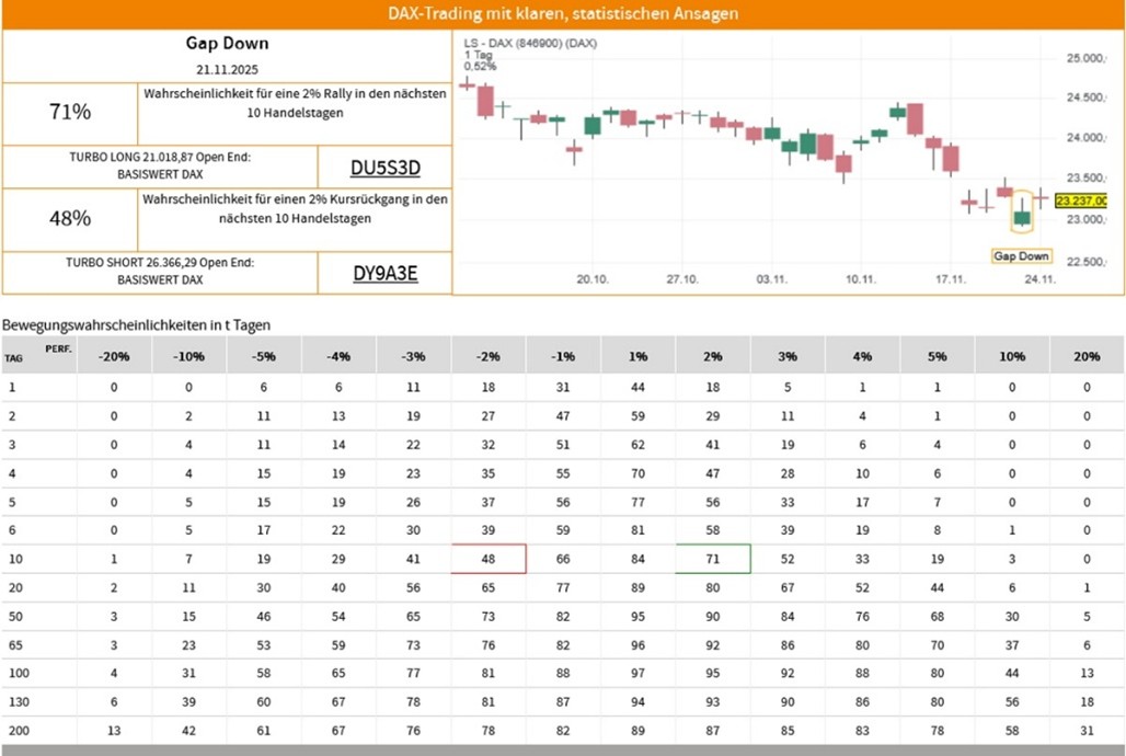 Die Erfolgswahrscheinlichkeiten für das Signal "Gap Down" beruhen auf einer historischen Auswertung des Signals auf den LS-DAX im Zeitraum vom 02.01.2000 bis zum 24.11.2025. Dabei wurden die folgenden Voreinstellungen und Filter vorgenommen: