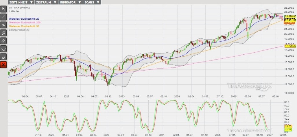 Der Chart zeigt die Entwicklung des Indikators der Slow Stochastik in der Vergangenheit. Zukünftige Ergebnisse können sowohl niedriger als auch höher ausfallen. Eine Kerze im Chart entspricht einer Börsenwoche. Quelle: https://www.dzbank-wertpapiere.de/markets/daxanalyse