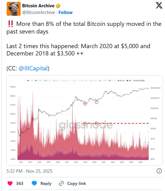 Bitcoin ist auf 21 Millionen Einheiten begrenzt, wovon ein erheblicher Teil dauerhaft verloren oder langfristig gehodlt wird. Umso überraschender ist die jüngste Bewegung: Laut On-Chain-Daten wurden in nur sieben Tagen rund 8 Prozent aller im Umlauf befindlichen Bitcoins transferiert - ein Volumen, das zuletzt 2018 und 2020 erreicht wurde.