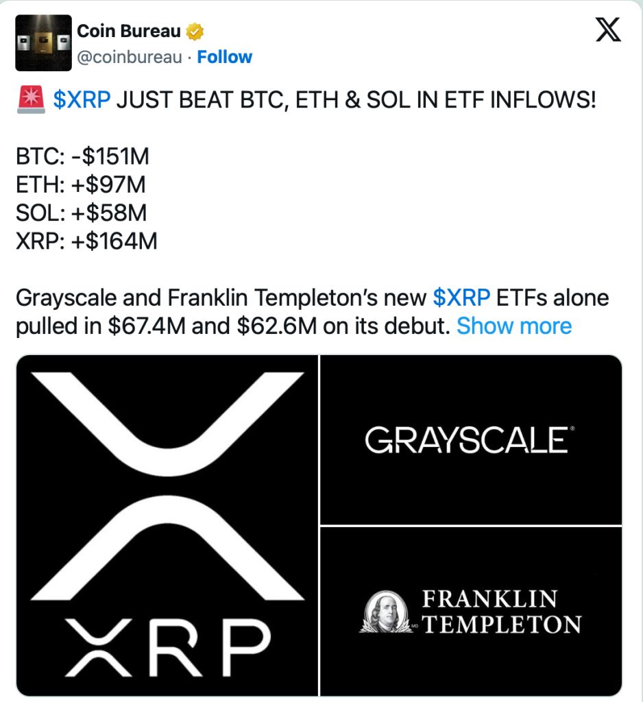 Ein wesentlicher Treiber dieser Entwicklung ist die starke Nachfrage nach XRP-ETFs, die in den vergangenen Tagen an den Start gegangen sind. Sowohl Grayscale als auch Franklin Templeton haben entsprechende Fonds aufgelegt, die gleich zum Launch massive Kapitalzuflüsse verbuchten:
