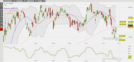 Der DAX konnte nach dem Gap-Down am 21. November am unteren Bollinger-Band Stabilisierungstendenzen zeigen. Anschließend wurde eine Erholungsbewegung eingeleitet, welche zum Abbau der überverkauften Situation beigetragen hat. Dabei wurde auch ein Kaufsignal in der Slow Stochastik getriggert. Es wurde ausgelöst, als die grüne Signallinie des Oszillators über die rote Signallinie gestiegen ist. Ein weiteres Kaufsignal könnte heute ausgelöst werden, sofern der gleitende Durchschnitt der letzten 200 Börsentage (=GD 200) auf Schlusskursbasis überwunden wird. Anschließend könnte der Index in Richtung des gleitenden Durchschnitts der letzten 20 Börsentage (=GD 20) tendieren.