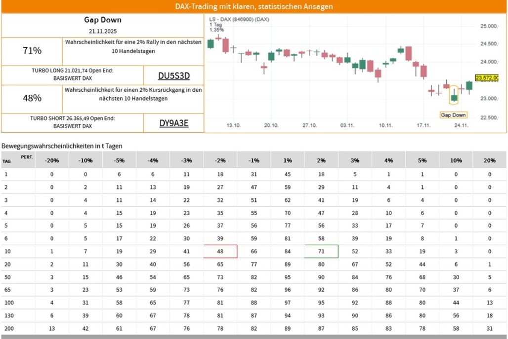 Die Erfolgswahrscheinlichkeiten für das Signal "Gap Down" beruhen auf einer historischen Auswertung des Signals auf den LS-DAX im Zeitraum vom 02.01.2000 bis zum 25.11.2025. Dabei wurden die folgenden Voreinstellungen und Filter vorgenommen: