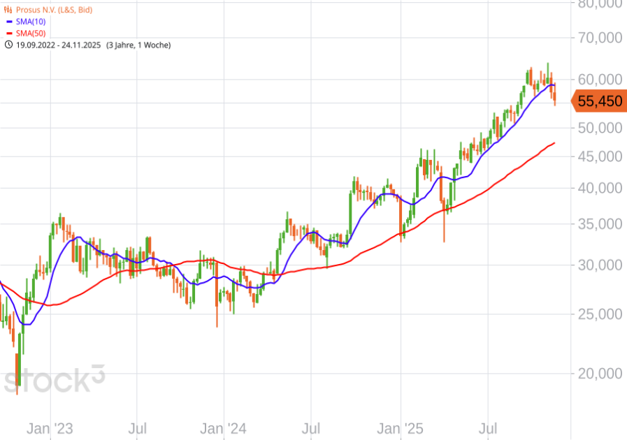 Die Internet-Beteiligungsholding hat den Umsatz um 22 % auf 3,62 Mrd. $ gesteigert, während sich das bereinigte EBIT auf 250 Mio. $ mehr als vervierfacht hat. Der Nettogewinn im fortgeführten Geschäft stieg um 14,3 % auf 4 Mrd. $, wobei auch Bewertungseffekte aus Beteiligungen dazu beitrugen. Analysten reagierten überwiegend positiv: Jefferies bestätigte das Kursziel von 65,50 € mit "Buy", Barclays beließ die Bewertung auf "Overweight" mit Kursziel 66,80 € und UBS stuft mit Ziel 79 € ebenfalls als "Buy" ein. Anerkannt wird, dass Prosus auf Kurs zur Erreichung der Ziele für das Geschäftsjahr ist, allerdings wird auch darauf hingewiesen, dass das Ergebnis im E-Commerce etwas unter dem Konsens lag. Fazit: Prosus zeigt deutliches Wachstum, der operative Schwung im E-Commerce ist erkennbar, aber die Bewertung bleibt ambitioniert.