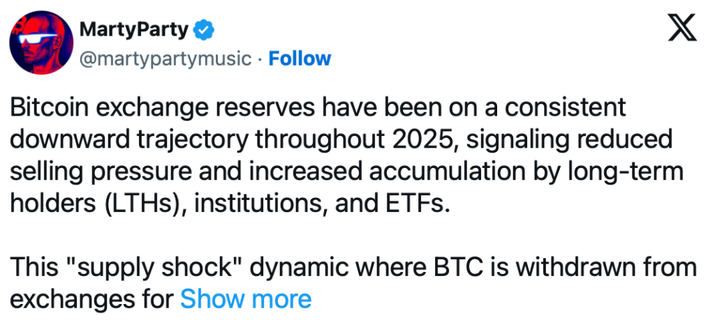 Das handelbare Angebot an Bitcoin schrumpft massiv. Seit Jahresbeginn wurden rund 20 Prozent der Bestände von zentralen Börsen abgezogen und in Self-Custody, institutionelle Verwahrung oder Unternehmensbilanzen transferiert. Dieser Trend beschleunigte sich 2025 deutlich.