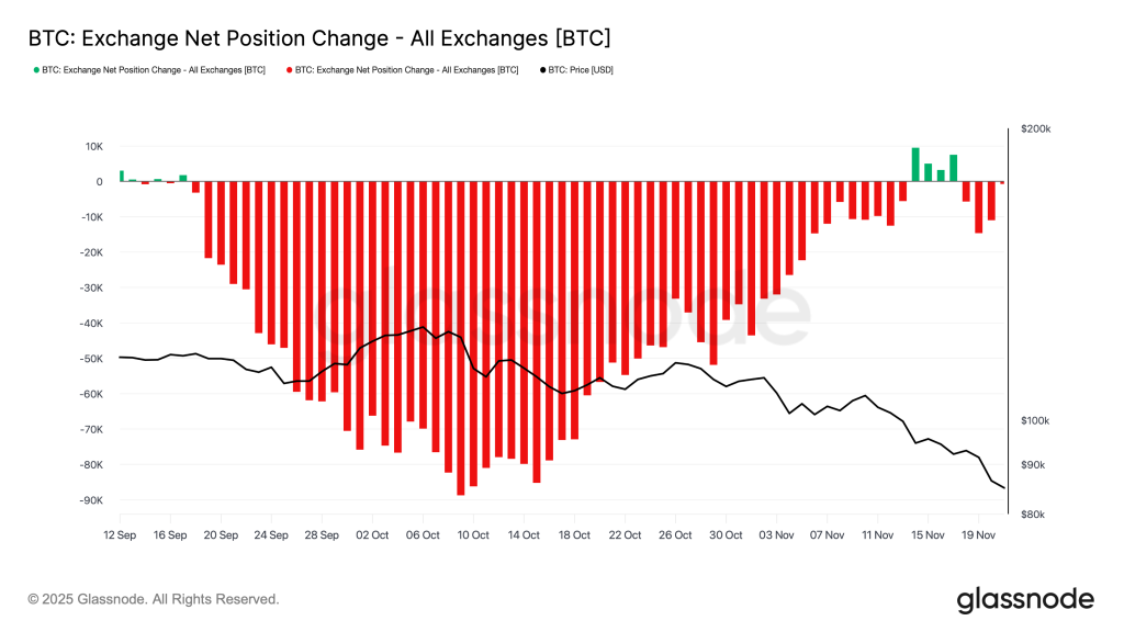 Die zentralen Börsenbestände fielen im November auf ein Sechsjahrestief - ein Niveau, das es zuletzt kurz vor dem Bullrun 2020 gab. Das Muster ist klar: Auf nahezu allen großen Börsen fließen seit Mitte September mehr Bitcoins ab, als hinzukommen. Selbst Kursschwächen sorgten diesmal nicht für Nettozuflüsse - ein historisch seltener Umstand, der die These eines sich weiter verknappenden Angebots unterstreicht.