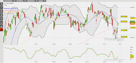 Die Kursstabilisierung nach dem Gap-Down am 21. November am unteren Bollinger-Band hat als Basis für eine Erholungsbewegung im langfristigen Aufwärtstrend fungiert. Hierbei konnte der Index an den letzten Handelstagen bereits über den gleitenden Durchschnitt der letzten 200 Börsentage (=GD 200) steigen. Hierdurch wurde ein Kaufsignal ausgelöst, welches derzeit noch durch ein weiteres Kaufsignal in der Slow Stochastik verstärkt wird. Sollten weitere Kursanstiege den Index in den kommenden Tagen auch noch über die gleitenden Durchschnitte der letzten 20 (=GD 20) sowie 50 Börsentage (=GD 50) führen, könnten zwei weitere Kaufsignale getriggert werden. Damit das Szenario der Trendfortsetzung ausgebaut werden kann, sollte der Index heute Anschlusskäufe verzeichnen und über das Tageshoch vom 26. November bei 23.721 Punkten (Widerstand 1) steigen. Dieser Etappenschritt könnte wiederum Anschlusskäufe bis zum GD 50 bei derzeit 23.952 Punkten (Widerstand 2) auslösen. Sofern auch dieses Hindernis überwunden werden sollte, dann könnte das entstehende Kaufsignal weitere Kursanstiege bis zum oberen Bollinger-Band auslösen. Impulse erwarten die Anleger heute insbesondere durch das GfK Konsumklima aus Deutschland. In den USA wird wiederum das Erntedankfest gefeiert. Vorbörslich wird der DAX mit einem Kursanstieg von +0,2 % getaxt. Das Long-Szenario ist hinfällig, wenn der DAX unter die Marke von 23.133 Punkten (Unterstützung 2) fällt.
