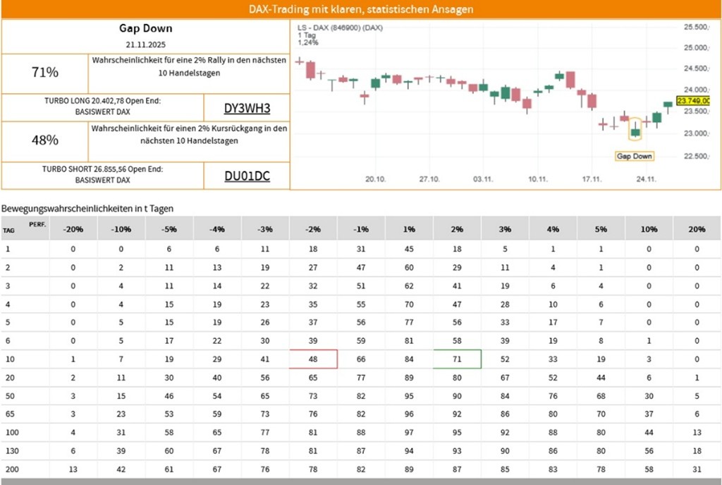 Die Erfolgswahrscheinlichkeiten für das Signal "Gap Down" beruhen auf einer historischen Auswertung des Signals auf den LS-DAX im Zeitraum vom 02.01.2000 bis zum 26.11.2025. Dabei wurden die folgenden Voreinstellungen und Filter vorgenommen: