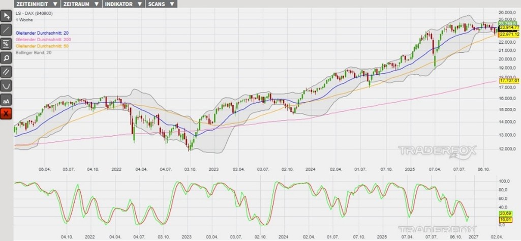 Der Chart zeigt die Entwicklung des Indikators der Slow Stochastik in der Vergangenheit. Zukünftige Ergebnisse können sowohl niedriger als auch höher ausfallen. Quelle: https://www.dzbank-wertpapiere.de/markets/daxanalyse