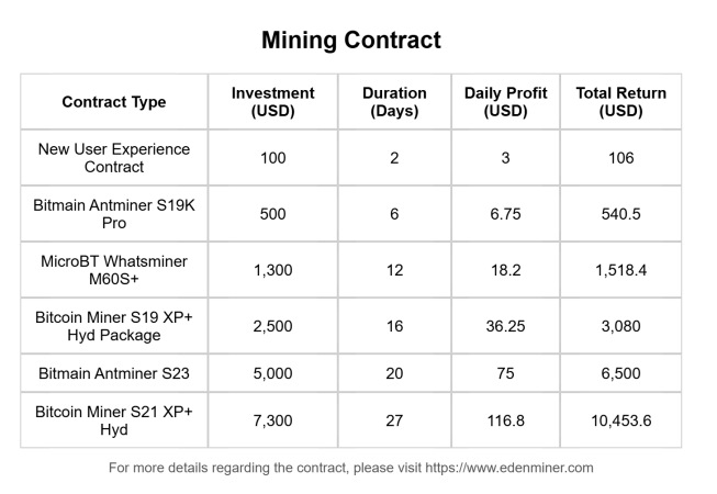 Eden Miner: Absoluter Komfort, keine Hürden, einfach Geld sammeln. Die Lösung von Eden Miner ermöglicht es Ihnen, sich ausschließlich auf Investitionen und das Sammeln von Geld zu konzentrieren, ohne sich um den Kauf von Maschinen, die Bezahlung von Stromrechnungen oder die Wartung der Geräte kümmern zu müssen.