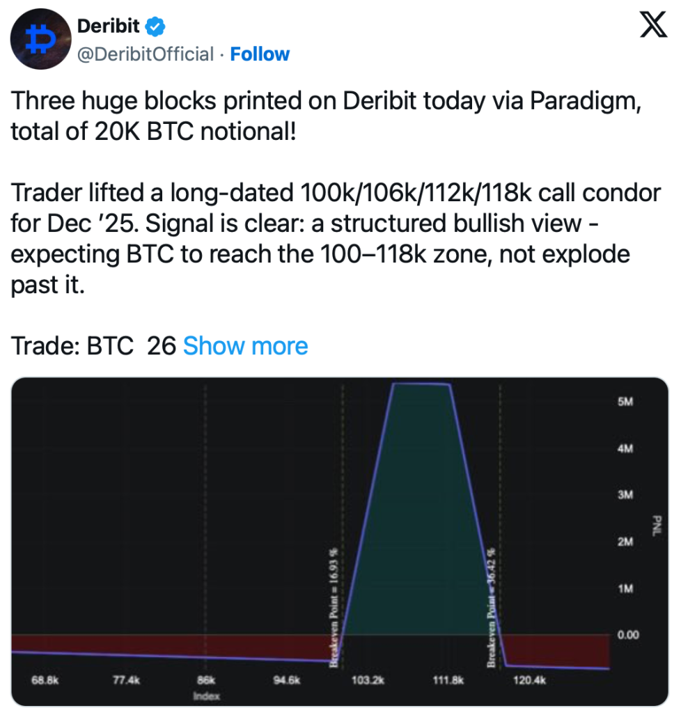 Aktuelle On-Chain-Daten zeigen, dass ein einzelner Trader auf Deribit eine Optionsstrategie im Gesamtwert von 1,76 Milliarden US-Dollar eröffnet hat. Dabei handelt es sich um eine Call-Condor-Strategie, die darauf setzt, dass Bitcoin zum Jahresende in einer Range zwischen 100.000 und 118.000 US-Dollar handelt.
