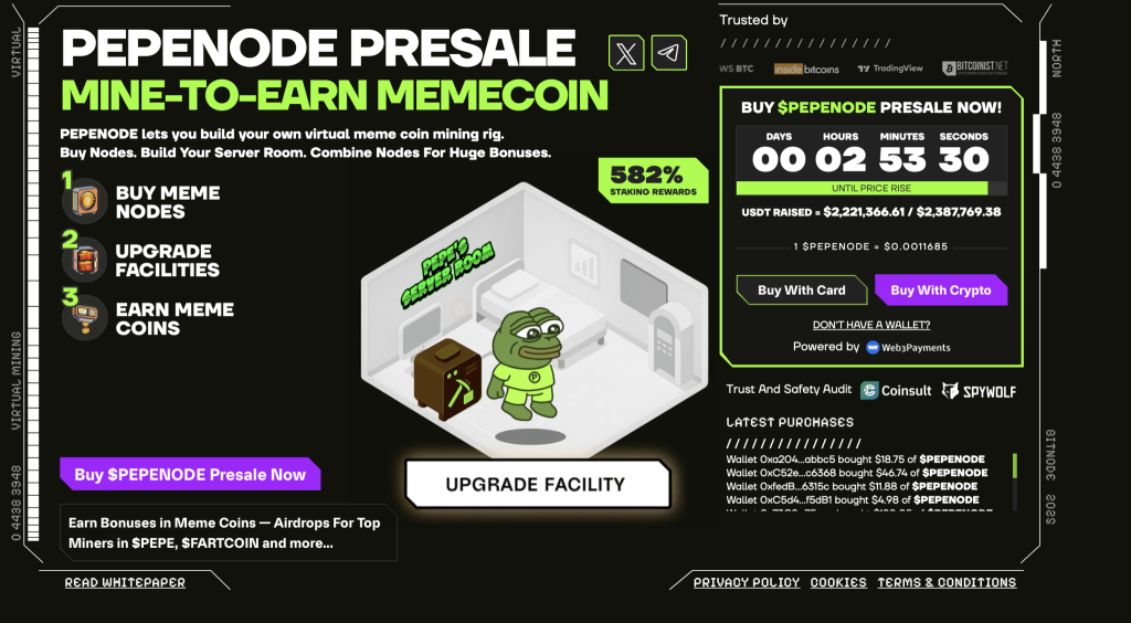 Pepenode setzt dort an, wo klassische Meme-Coins an ihre Grenzen stoßen. Statt sich rein auf Hype zu verlassen, verbindet das Projekt ein spielerisches Konzept mit echtem wirtschaftlichen Nutzen. Nutzer bauen in einer virtuellen Serverwelt ihre eigenen Mining-Setups auf, verbessern ihre Nodes und steigern so ihre Hashrate. Belohnt werden sie mit echten Meme-Coins wie PEPE oder FARTCOIN.