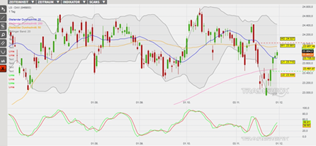 Charttechnisch konnte die erfolgreiche Kursstabilisierung nach einem Gap-Down am 21. November am unteren Bollinger-Band die Basis für die Fortsetzung des langfristigen Aufwärtstrends legen. Seither ist es dem DAX gelungen, an fünf aufeinander folgenden Handelstagen jeweils ein höheres Tageshoch zu markieren. Diese positive Kursreaktion hat zugleich dazu beigetragen, dass derzeit die gleitenden Durchschnitte der letzten 200 (= GD 200) und 20 Börsentage (= GD 20) überwunden wurden. Ein drittes Kaufsignal wird momentan durch die Slow Stochastik geliefert. Sollten Anschlusskäufe die Trendfortsetzung bestätigen, dann könnte die Zurückeroberung des gleitenden Durchschnitts der letzten 50 Börsentage (= GD 50) zeitnah ein weiteres Kaufsignal erzeugen. In diesem Szenario markiert das Tageshoch vom 28. November bei 23.881 Punkten (Widerstand 1) die erste Hürde. Der Kursanstieg über dieses Hindernis könnte Kursanstiege in Richtung des GD 50 und anschließend bis zum Tageshoch vom 14. November bei 24.027 Punkten (Widerstand 2) auslösen. Impulse erwarten die Anleger heute unter anderem durch die Einkaufsmanagerindizes für das verarbeitende Gewerbe im November aus Deutschland, der Euro-Zone sowie den USA. Vorbörslich wird der DAX mit einem Kursrückgang von -0,6 % getaxt. Das Long-Szenario ist hinfällig, wenn der DAX unter die Marke von 23.444 Punkten (Unterstützung 2) fällt.