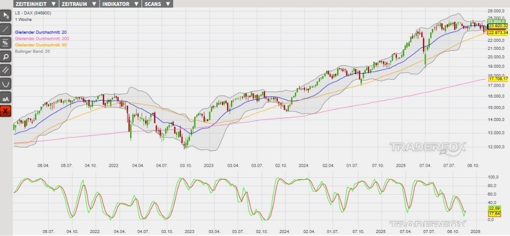 Nachdem der DAX am 09. Oktober ein Allzeithoch im überkauften Bereich über dem oberen Bollinger-Band markiert hat, wurde eine Korrekturbewegung eingeleitet. Hierbei wurde eine untergeordnete Abwärtstrendstruktur mit sinkenden Verlaufshochs und -tiefs im Chart etabliert. Ein markantes Verlaufshoch wurde am 12. November ausgebildet. Sollte die jüngste Zwischenerholung zeitnah ebenfalls in einem niedrigeren Verlaufshoch münden, dann könnte wiederum die Basis für die nächste Verkaufswelle gelegt werden. Derzeit weist lediglich noch der gleitende Durchschnitt der letzten 50 Börsentage (= GD 50) ein Verkaufssignal aus. Sollte der Abgabedruck erhöht werden, dann könnten weitere Verkaufssignale entstehen.