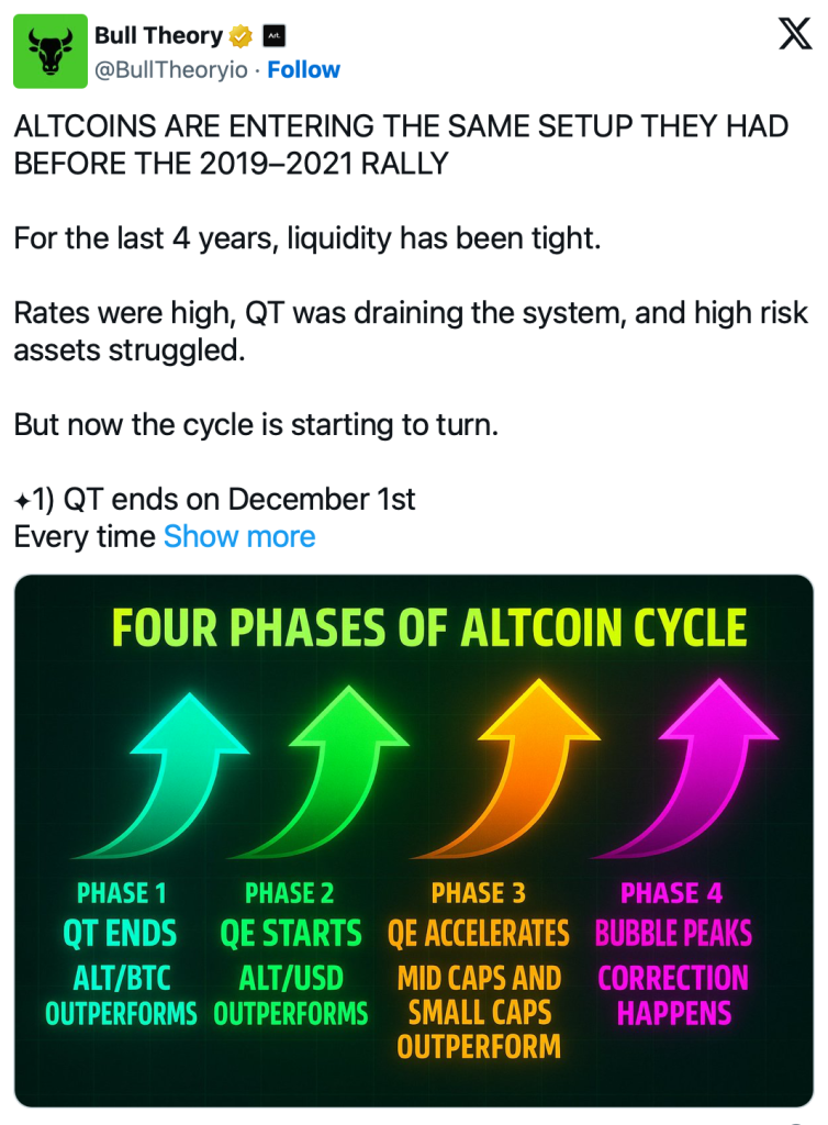 Ein möglicher Katalysator für eine Trendwende ist das Ende des Quantitative Tightening (QT) am 1. Dezember. Historisch folgten auf das Ende der geldpolitischen Straffung regelmäßig deutliche Erholungsphasen an den Finanzmärkten. Dasselbe Muster zeigte sich bereits 2019, als Altcoins gegenüber Bitcoin um bis zu 90 Prozent zulegen konnten - selbst während Bitcoin zwischenzeitlich konsolidierte.