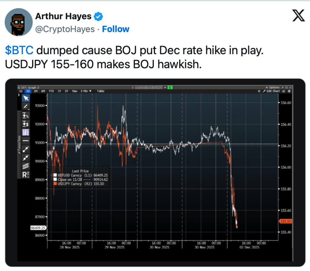 Diese Entwicklung trifft auf ein ohnehin sensibles Marktumfeld. Sinkende Liquidität und eine restriktivere BOJ-Politik erhöhen den Druck auf Kryptowährungen zusätzlich.