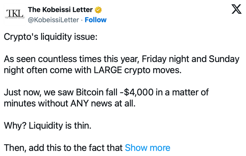Besonders Sonntag- und Freitagabende gelten im Kryptomarkt als anfällig. Bereits moderate Verkaufsvolumina können massive Kursreaktionen auslösen. Die jüngsten Bewegungen passen daher weniger zu neuen Informationen, sondern vielmehr zu der technisch fragilen Situation, in der sich Bitcoin aktuell befindet.