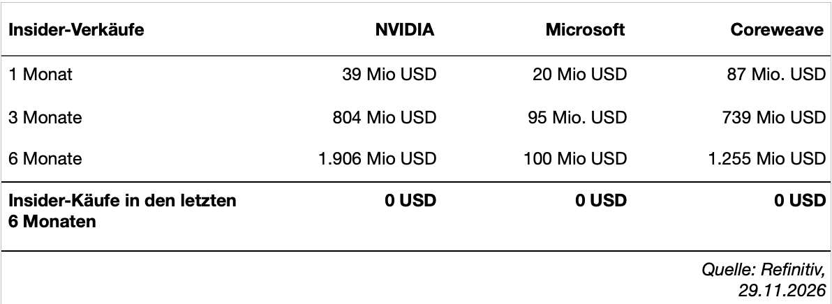 Ebenso wichtig ist es zu wissen, wo sich Insider im großen Stil zurückziehen. Anders formuliert: Unternehmensinsider die viel wissen verkaufen Anteile ihrer Firma an Investoren, die über deutlich weniger Informationen verfügen. Werfen wir einen Blick auf NVIDIA, Microsoft und Coreweave: