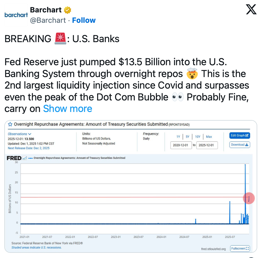 Hinzu kommt, dass die Fed ihr über Jahre laufendes QT-Programm gestoppt hat und wieder Liquidität in den Markt gibt. Allein am Dienstag flossen 13,5 Milliarden US-Dollar über Repo-Geschäfte ins Bankensystem - ein bedeutender Impuls für Kapitalmärkte. Dennoch warnen Experten vor übertriebenem Optimismus: Laut Timo Emden könnte die aktuelle Erholung nur eine fragile Atempause sein, bevor der Abwärtstrend weitergeht.