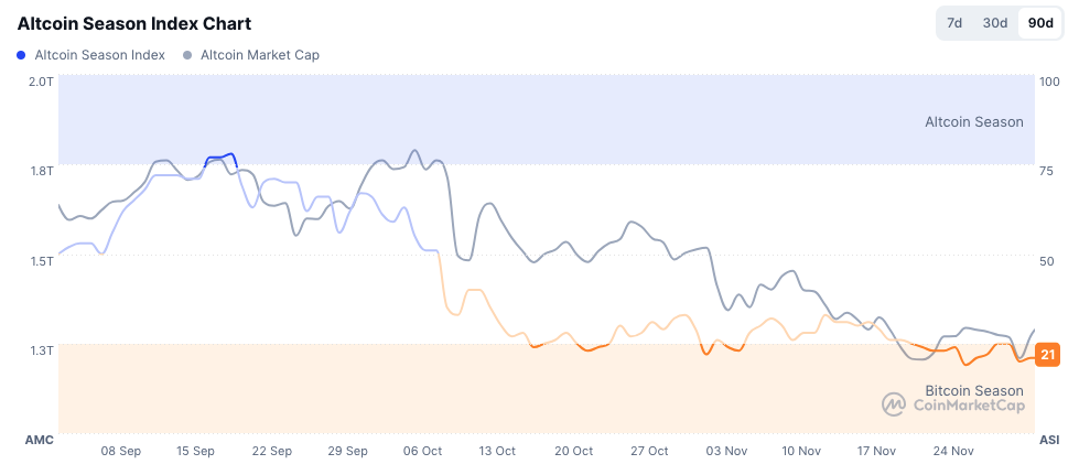 Trotz der starken Aufwärtsbewegungen blieb die allgemeine Marktstimmung bisher zurückhaltend. Der Altcoin-Season-Index steht weiterhin bei nur 21 von 100 Punkten. Sollte sich jedoch eine echte Altcoin-Season entwickeln, könnte diese gerade erst beginnen.