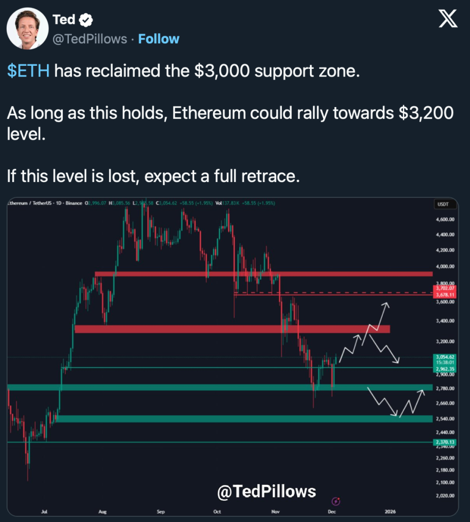 Analysten wie Ted Pillows sehen kurzfristiges Potenzial in Richtung 3.200 $. Sollte ETH jedoch erneut unter 3.000 $ fallen, wären Rücksetzer in Richtung 2.800 $ oder 2.600 $ denkbar. Ein bullisches Zeichen bleibt jedoch bestehen: ETH hat zuletzt ein Higher Low gebildet, was häufig auf eine Trendwende hindeutet.